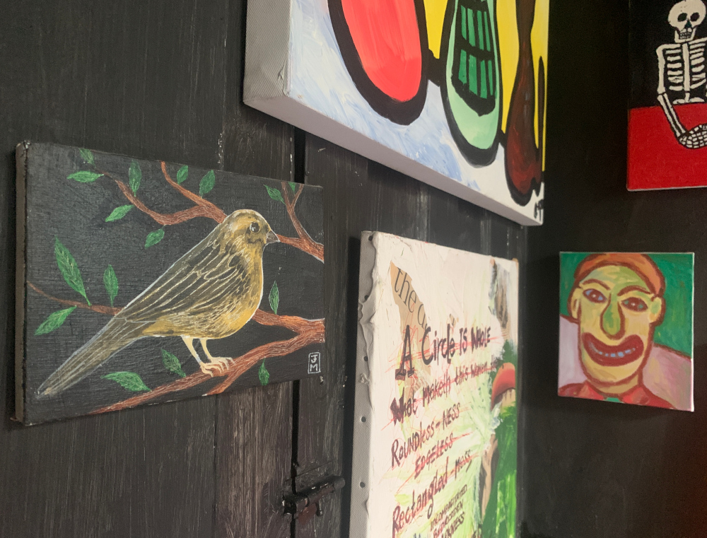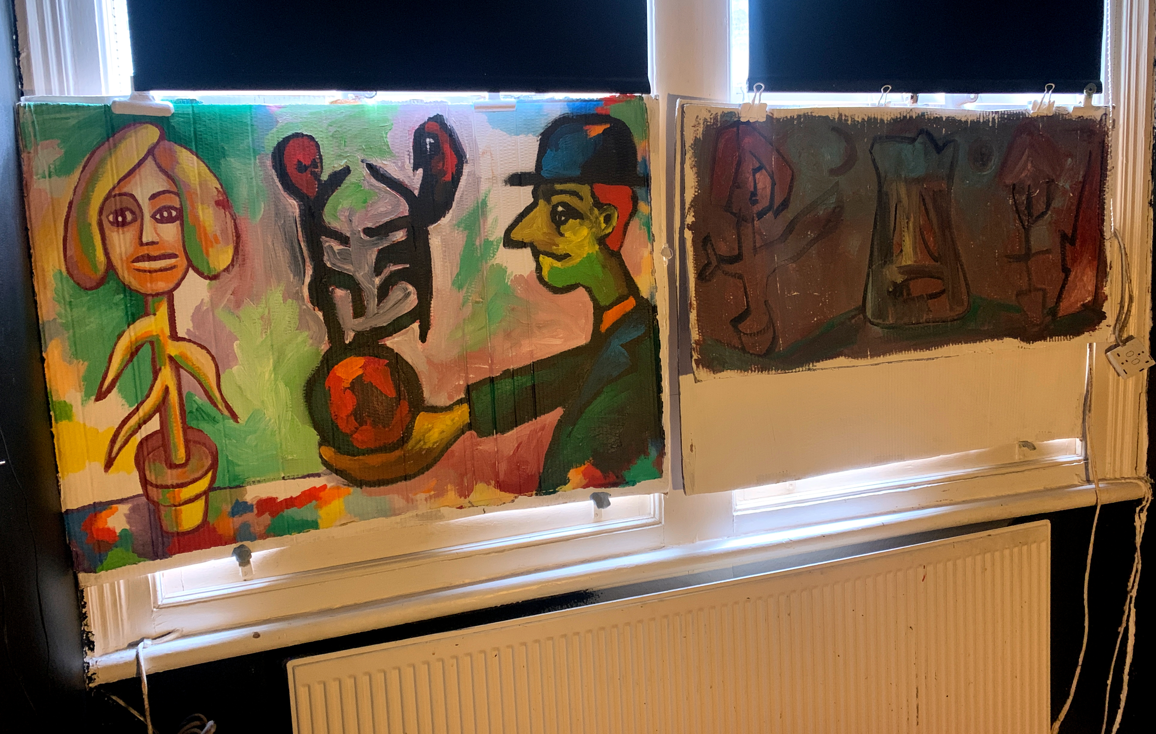 Left: Joe Machine’s bird. Right: Charles Thomson’s man grinning like an idiot (after Billy Childish). Stuckism : An exhibition at Black Ivory Printmaking & Audio Club. Photo: Edgeworth Johnstone, 18 June 2022.