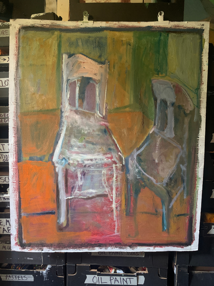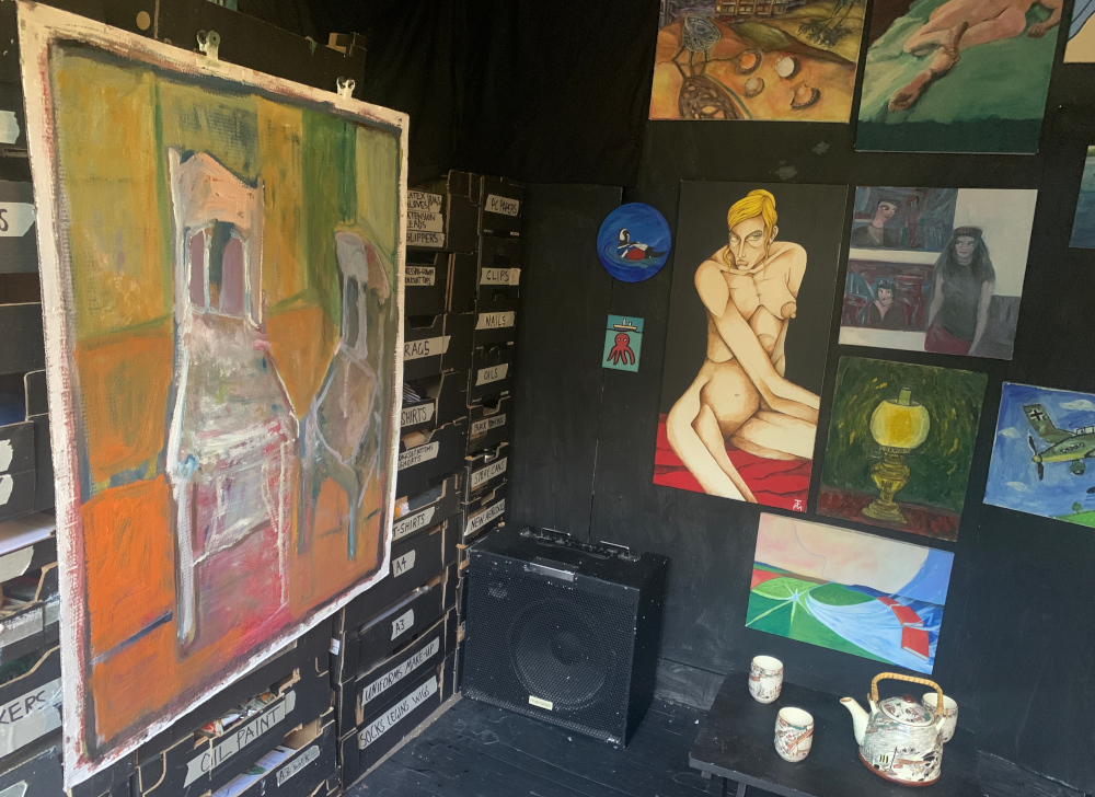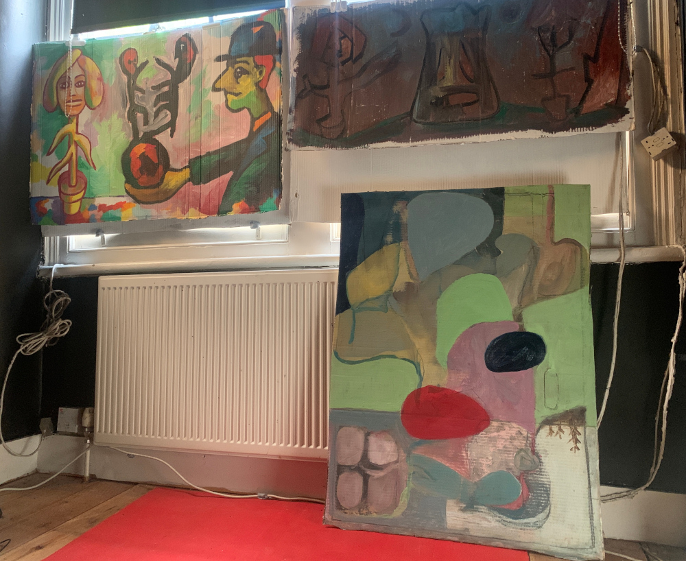 ‘Stuckism is Wrong’ The Other Muswell Hill Stuckists. 2020 video‘Joseph Boyice – stucker pilot and dare devil artist’ 1992 by ex-Stuckist Billy Childish. Stuckism : An exhibition at Black Ivory Printmaking & Audio Club. Photo: Edgeworth Johnstone, 21 June 2022.A collaboration painting of two chairs by Billy Childish and Edgeworth Johnstone. Stuckism : An exhibition at Black Ivory Printmaking & Audio Club. Photo: Edgeworth Johnstone, 21 June 2022.Bottom right: Work in progress, a collaboration painting by Black Francis and Edgeworth Johnstone. Top: Collaboration paintings by Charles Thomson and Edgeworth Johnstone. Stuckism : An exhibition at Black Ivory Printmaking & Audio Club. Photo: Edgeworth Johnstone, 21 June 2022.Black Francis of the Amherst Stuckists at Billy Childish’s studio in Chatham Dockyard, Kent, UK. This painting is a work in progress collaboration with Edgeworth Johnstone.Black Francis and Edgeworth Johnstone painting area in Billy Childish’s art studio.