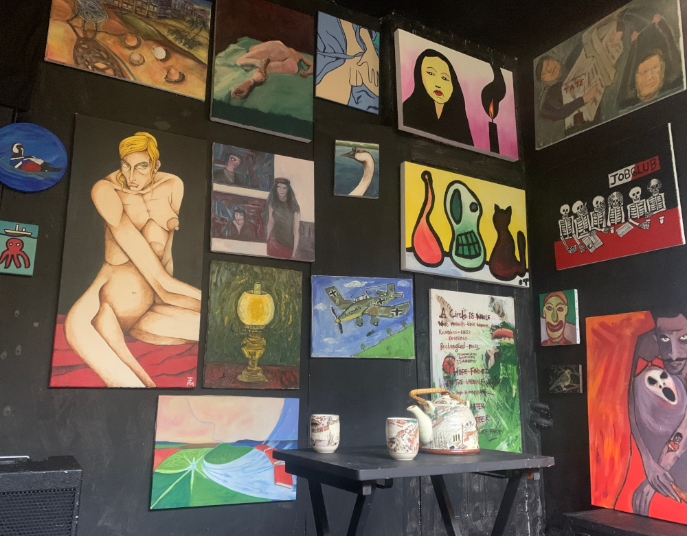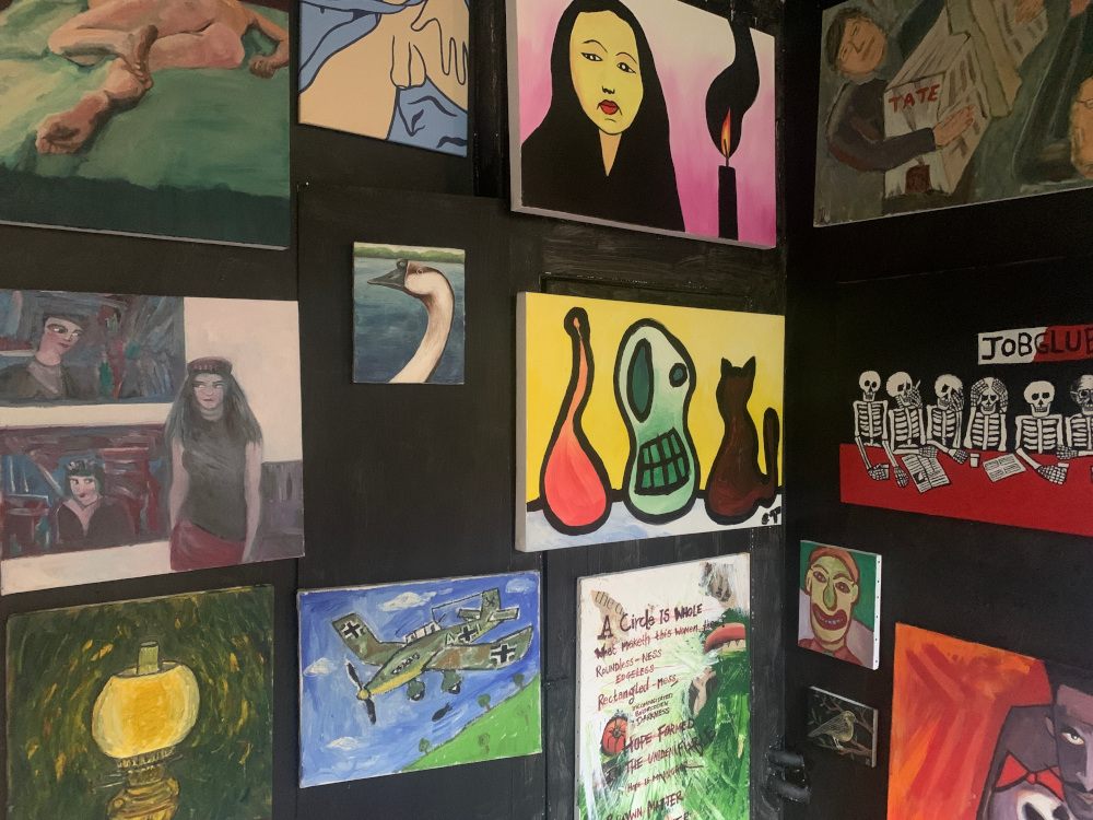 Portrait of Shelley Li – Charles ThomsonTop left: Charles Thomson’s portrait of Shelley Li. Bottom left: Charles Thomson’s ground-breaking still life. Top right: Mark D’s double portrait of Charles Thomson and Sir Nicholas Serota. Bottom right: Philip Absolon’s Job Club. Stuckism : An exhibition at Black Ivory Printmaking & Audio Club. Photo: Edgeworth Johnstone, 18 June 2022.Stuckism : An exhibition at Black Ivory Printmaking & Audio Club. Photo: Edgeworth Johnstone, 21 June 2022.An individual form to shared experience. Collaboration paintings by Charles Thomson and Edgeworth Johnstone. Taken before the 21 June addition of works by Billy Childish, Black Francis and a Childish Johnstone collaboration. Stuckism : An exhibition at Black Ivory Printmaking & Audio Club. Photo: Edgeworth Johnstone, 18 June 2022.