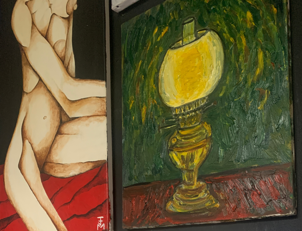 Left: A female nude by Joe Machine. Right: A still life by ex-Stuckist Wolf Howard. Stuckism : An exhibition at Black Ivory Printmaking & Audio Club. Photo: Edgeworth Johnstone, 18 June 2022.