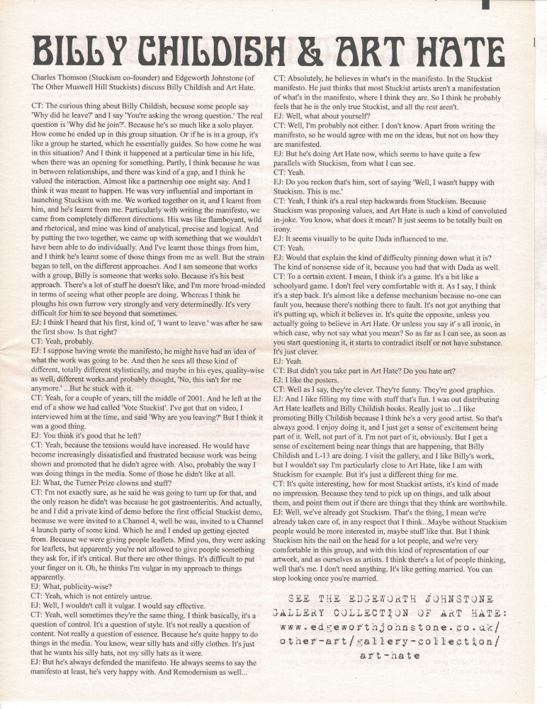 Charles Thomson (Stuckism co-founder) and Edgeworth Johnstone (of The Other Muswell Hill Stuckists) discuss Billy Childish and Art Hate.