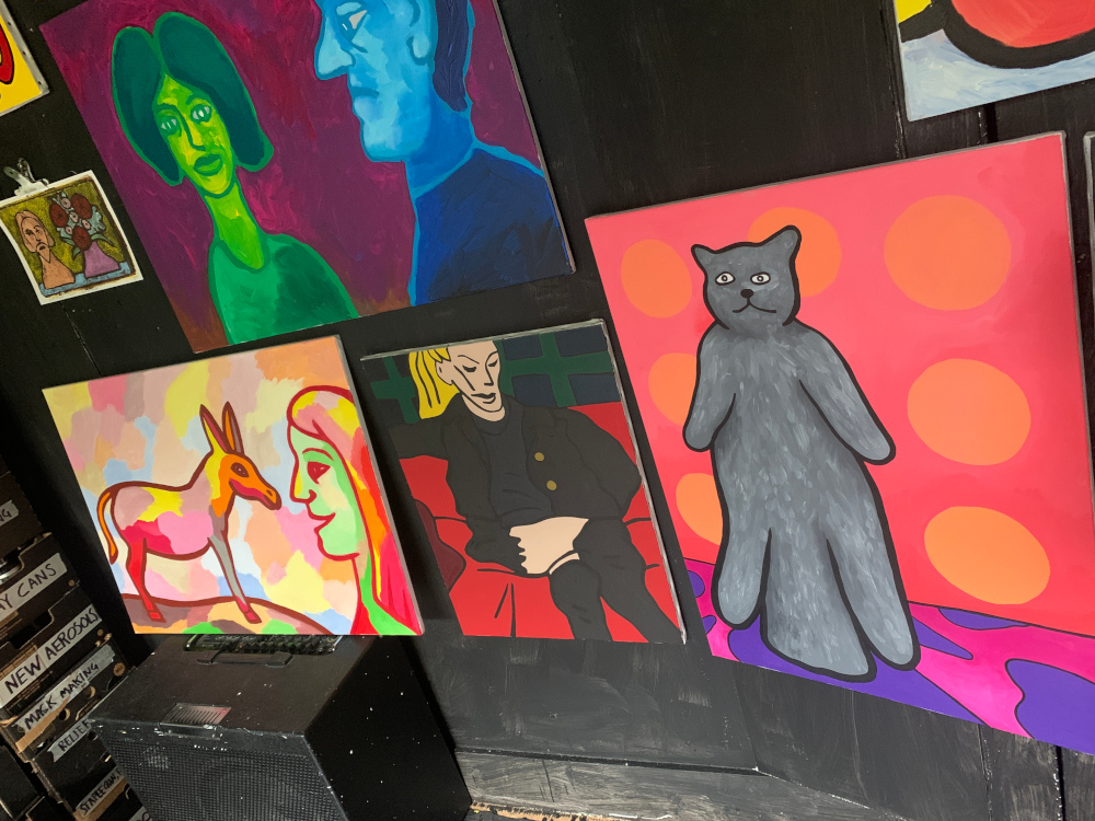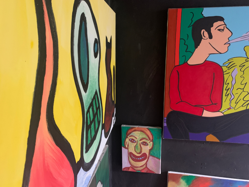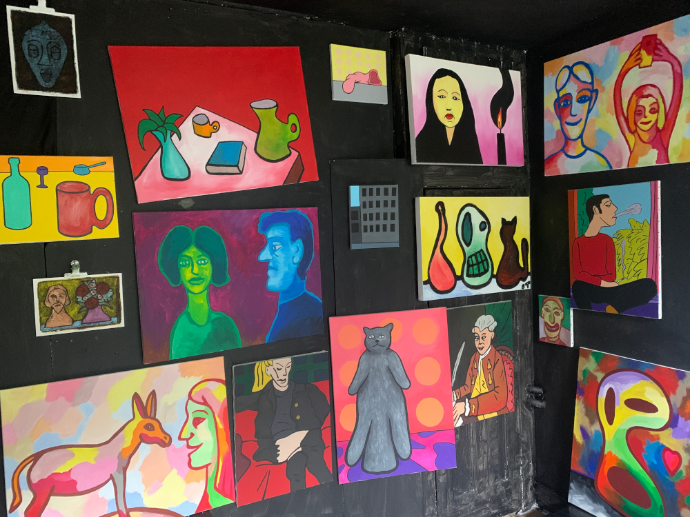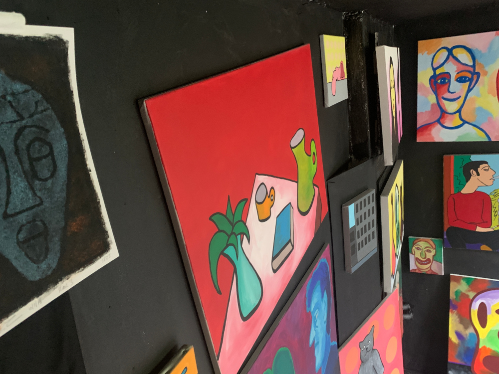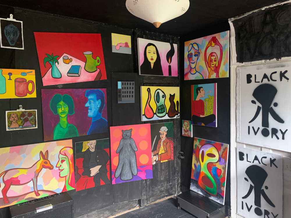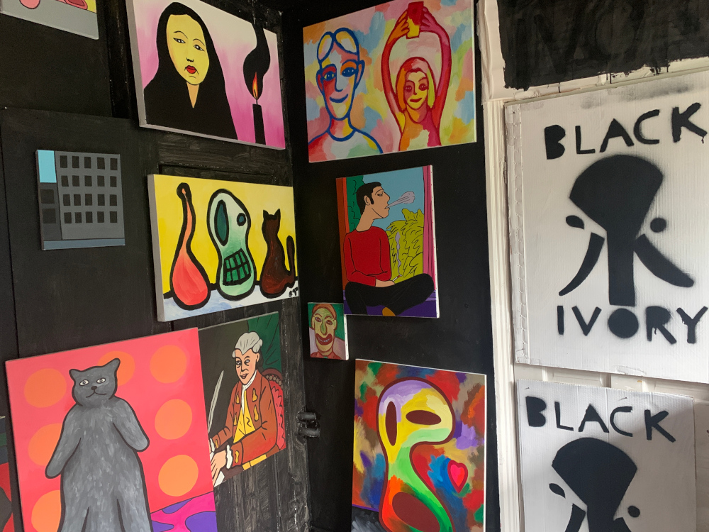 Mr. Stuckism a Charles Thomson solo exhibition at Black Ivory Printmaking & Audio Club. Photo: Edgeworth Johnstone 21st July 2022.Mr. Stuckism a Charles Thomson solo exhibition at Black Ivory Printmaking & Audio Club. Photo: Edgeworth Johnstone 21st July 2022. The art gallery was painted black in order to adhere as strongly as possible to the principles of the Stuckist manifesto.Mr. Stuckism a Charles Thomson solo exhibition at Black Ivory Printmaking & Audio Club. Photo: Edgeworth Johnstone 21st July 2022. View from below of the main painting area.Mr. Stuckism a Charles Thomson solo exhibition at Black Ivory Printmaking & Audio Club. Photo: Edgeworth Johnstone 21st July 2022. Notice the two small works on paper. Both made at Black Ivory Printmaking & Audio Club before the audio part.Mr. Stuckism a Charles Thomson solo exhibition at Black Ivory Printmaking & Audio Club. Photo: Edgeworth Johnstone 21st July 2022. Note the rare deep edge to the two paintings Thomson painted in Black Ivory Printmaking & Audio Club in early 2013.Mr. Stuckism a Charles Thomson solo exhibition at Black Ivory Printmaking & Audio Club. Photo: Edgeworth Johnstone 21st July 2022. Note the similarity between the double portrait and the composition of many of Thomson’s still life paintings.Mr. Stuckism a Charles Thomson solo exhibition at Black Ivory Printmaking & Audio Club. Photo: Edgeworth Johnstone 21st July 2022. Note the portrait painting of SP Howarth.Mr. Stuckism a Charles Thomson solo exhibition at Black Ivory Printmaking & Audio Club. Photo: Edgeworth Johnstone 21st July 2022. The small painting is after a Billy Childish painting.Mr. Stuckism a Charles Thomson solo exhibition at Black Ivory Printmaking & Audio Club. Photo: Edgeworth Johnstone 21st July 2022. Thomson psychedelia. Mr. Stuckism a Charles Thomson solo exhibition at Black Ivory Printmaking & Audio Club. Photo: Edgeworth Johnstone 21st July 2022. The small condom painting is one of many Thomson condom paintings of the same palette and size.Mr. Stuckism a Charles Thomson solo exhibition at Black Ivory Printmaking & Audio Club. Photo: Edgeworth Johnstone 21st July 2022. The mask is one of many hand-made one-off oil paint prints Thomson made of this image.Mr. Stuckism a Charles Thomson solo exhibition at Black Ivory Printmaking & Audio Club. Photo: Edgeworth Johnstone 21st July 2022. The hang is slightly wonky as it uses the same nails as the previous exhibition.Mr. Stuckism a Charles Thomson solo exhibition at Black Ivory Printmaking & Audio Club. Photo: Edgeworth Johnstone 21st July 2022. The Black Ivory door panels are a permanent feature of the Black Ivory Printmaking & Audio Club.Mr. Stuckism a Charles Thomson solo exhibition at Black Ivory Printmaking & Audio Club. Photo: Edgeworth Johnstone 21st July 2022. The gaffer taped Sainsburys cardboard box the skull painting is sitting on was custom made for this exhibition.Mr. Stuckism a Charles Thomson solo exhibition at Black Ivory Printmaking & Audio Club. Photo: Edgeworth Johnstone 21st July 2022. A collaboration painting by Charles Thomson and Edgeworth Johnstone.Mr. Stuckism a Charles Thomson solo exhibition at Black Ivory Printmaking & Audio Club. Photo: Edgeworth Johnstone 21st July 2022. A collaboration painting by Charles Thomson and Edgeworth Johnstone.